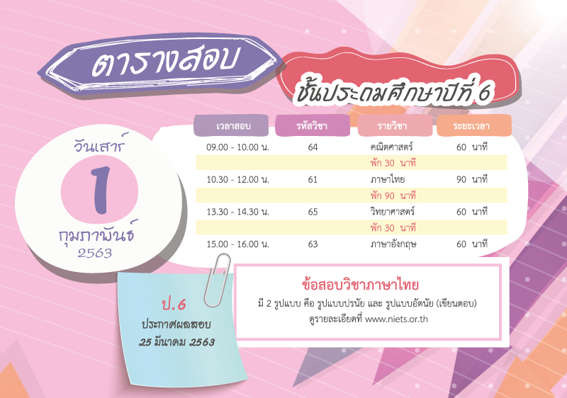 วันเสาร์ที่ 1 กุมภาพันธ์ 2563 สอบ O - Net ป.6 ปีการศึกษา 2562 วันเสาร์ที่ 1 กุมภาพันธ์ 2563 นักเรียนระดับชั้นประถมศึกษาปีที่ 6 โรงเรียนอนุบาลธิดาเมตตาธรรมพัทลุง สอบ O - Net ประจำปีการศึกษา 2562 สนามสอบ โรงเรียนเรวดีพัทลุง เวลาสอบ 09.00 - 16.00 น. ประการศผลสอบวันที่ 25 มีนาคม 2563
