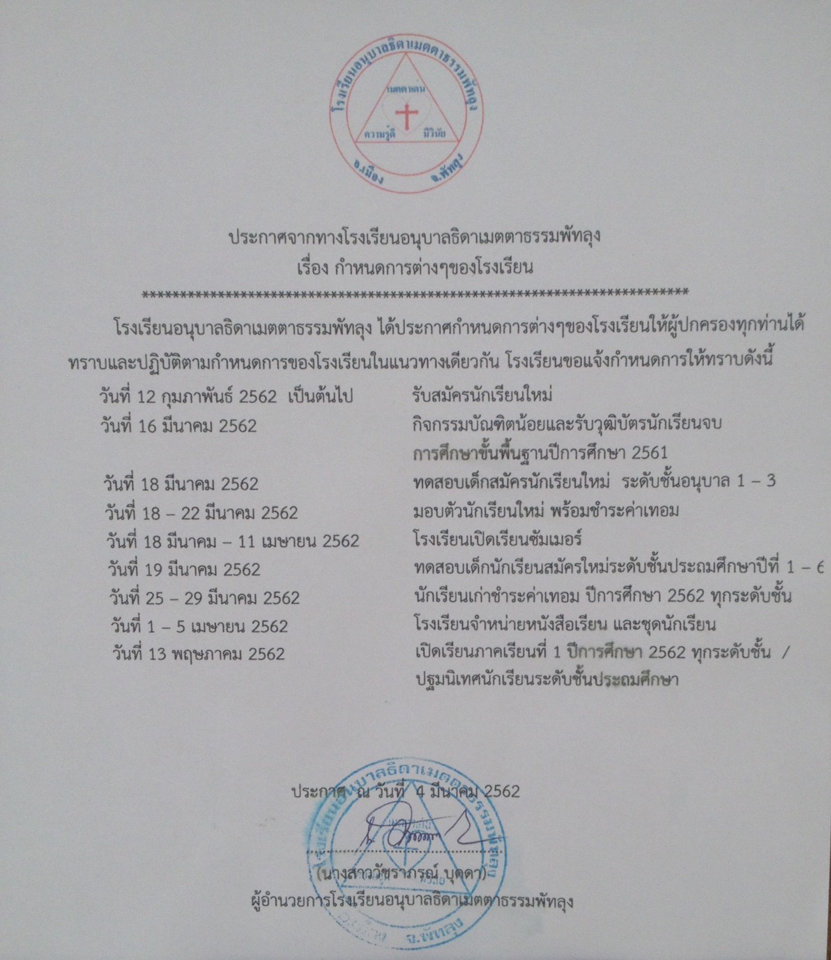เลื่อนสอบปลายภาคเรียนที่ 2 ประจำปีการศึกษา 2562 โรงเรียนอนุบาลธิดาเมตตาธรรมพัทลุง เลื่อนสอบปลายภาคเรียนที่ 2 ประจำปีการศึกษา 2562 มาเป็นวันที่ 3 , 5 , 6 มีนาคม 2563